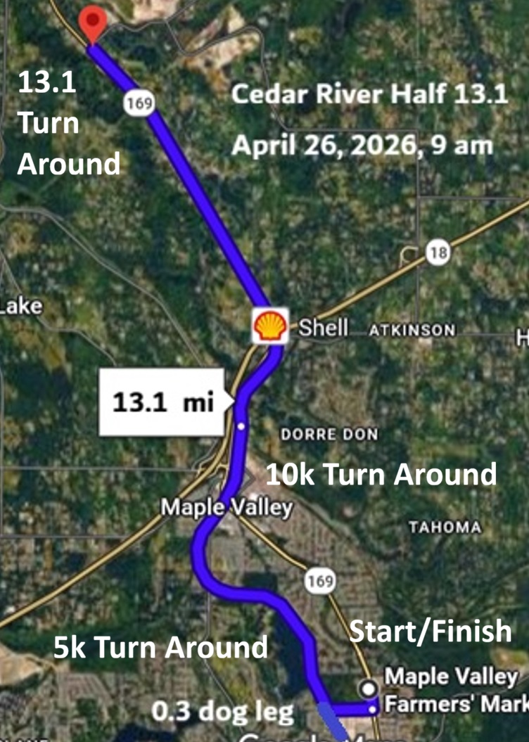 Cedar River Half 13.1, 10k, 5kSun, Apr 26Maple Valley Market Place